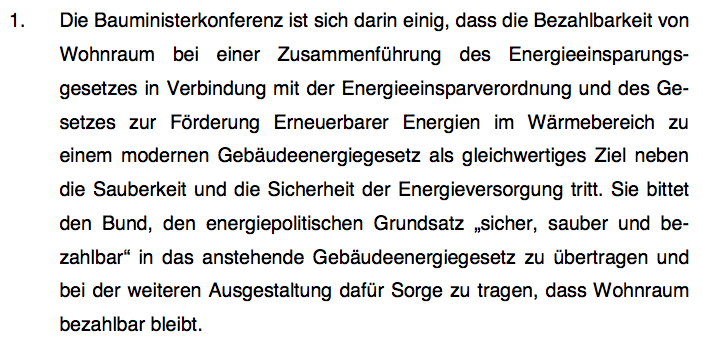 Noch bevor der Referentenentwurf des Gebäudeenergiegesetz offiziell freigegeben ist, ruft es, selbst mit dem vorstehenden Umsetzungsstand, Widerstand hervor – etwa in Form eines Antrages der Landesregierung des Landes Nordrhein-Westfalen auf Entschließung des Bundesrates zur Berücksichtigung der Aspekte des bezahlbaren Bauens und Wohnens im geplanten Gebäudeenergiegesetz (28.05.2019, BR-Drucksache 249/19). Dort geht es jedoch nicht um einen konkreten Lösungsvorschlag für die Mieten- und Wohnraumfrage im Zusammenhang mit dem Gebäudeenergiegesetz, sondern letztlich um ein allgemeines Plädoyer, die Aufgabe der Daseinsvorsorge in Form der Versorgung der Bevölkerung mit Wohnraum kostengünstig zu erfüllen und das Preisargument in den Mittelpunkt der Politik zu stellen.