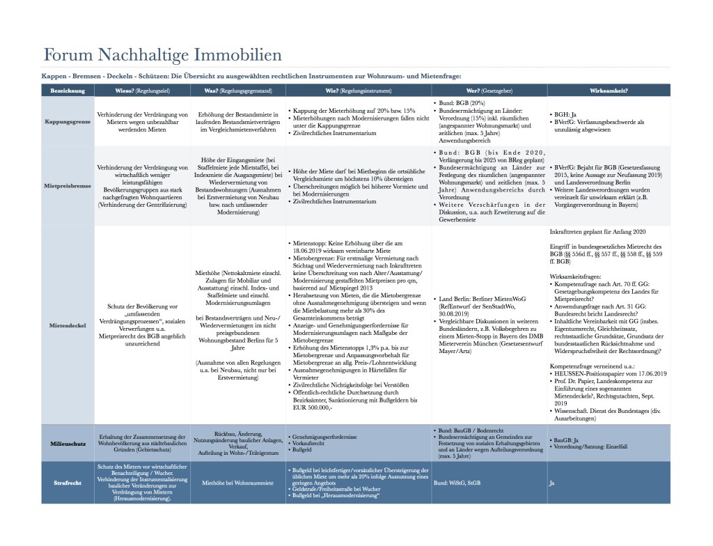 So scheint also irgendwie alles mit allem zusammenzuhängen und selbst das Strafrecht spielt, was gerne übersehen wird, eine gewisse Rolle. Und während wohl erst ein Gericht verbindlich zu klären haben wird, ob ein Landes-Mietendeckel insbesondere aufgrund der Bundeskompetenz sowohl für das Mietpreisrecht des BGB wie auch für das Bodenrecht und soziale Erhaltungsrecht des BauGB Bestand haben kann, ist es Zeit für eine Übersicht zu ausgewählten Rechtsinstrumentarien im Rahmen der aktuellen Wohnraum- und Mietenfrage: