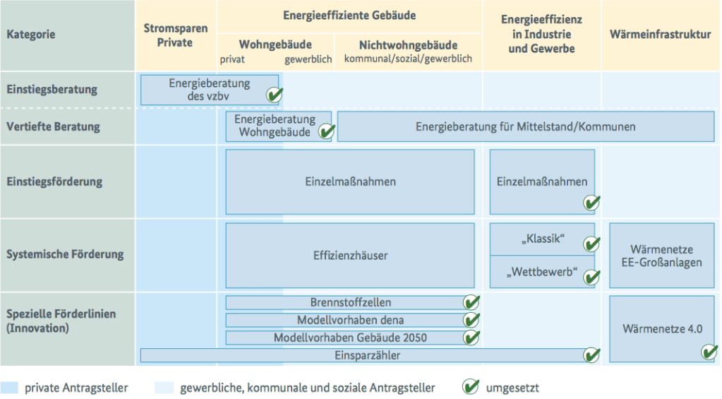 Dazu kommt eines Staffelung der Förderungen von dem „leichten Einstieg“ in Energiesparmaßnahmen (u. a. niederschwellige Beratung und Einzelmaßnahmen) bis hin zu ganzheitlichen, umfassenden Effizienzmaßnahmen mit höherer Förderung.