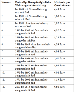 - qm-definierte Tabellenwerte für die maximal zulässige monatliche Nettokaltmiete inkl. Zuschläge nach den Kriterien der erstmaligen Bezugsfertigkeit und grundlegender Ausstattungsmerkmale,