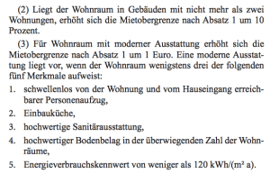 Bei Wiedervermietungen (Note: nur bei Wiedervermietung) mit moderner Ausstattung (zwei Merkmale ausreichend, siehe noch nachstehend zur Mietobergrenze) darf der Mietenstopp um EUR 1/qm, höchstens jedoch auf EUR 5,02/qm Wohnfläche erhöht werden, wenn die zuvor zulässige Miete weniger als EUR 5,02/qm Wohnfläche betrug.