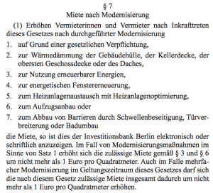 Die Modernisierungsregelung des MietenWoG Bln ermöglicht eine Erhöhung der nach § 3 und § 6 MietenWoG Bln geltenden öffentlich-rechtlichen Preisobergrenzen. Für das vertragliche Recht des Vermieters gegenüber dem Mieter zur Mieterhöhung muss der Vermieter selber sorgen – und zwar weiterhin nach den Regeln des BGB. Augen auf bei der Gestaltung von Verträgen und Schreiben! Der konkrete Betrag ist anhand des BGB zu begründen, das MietenWoG Bln nennt nur einen Maximalbetrag von EUR 1/qm – keine Pauschale.