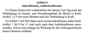 Das MietenWoG Bin gilt ab Inkrafttreten (Tag nach Verkündung), also ab dem 23.02.2020. Es gilt für die Dauer von 5 Jahren ab Inkrafttreten, also bis zum 22.02.2025.