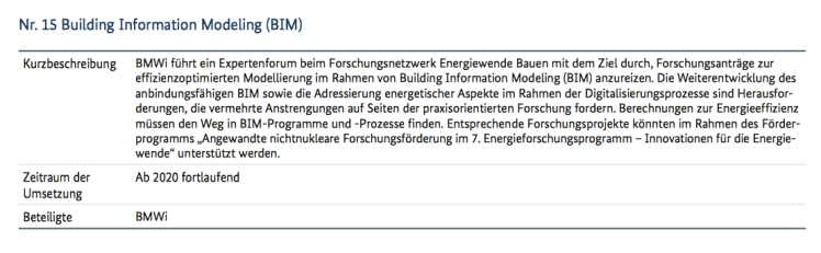 Nicht nur die EU BIM Task Group hat bereits früh auf die Bedeutung der Digitalisierung für den Klimaschutz und umgekehrt den Klimaschutz als Treiber der Digitalisierung hervorgehoben. Das setzt sich auf nationaler Ebene fort, indem etwa das Klimaschutzprogramm der Bundesregierung dies aufgreift und deren Effizienzstrategie BIM als Energieeffizienzmaßnahme Nr. 15 führt.