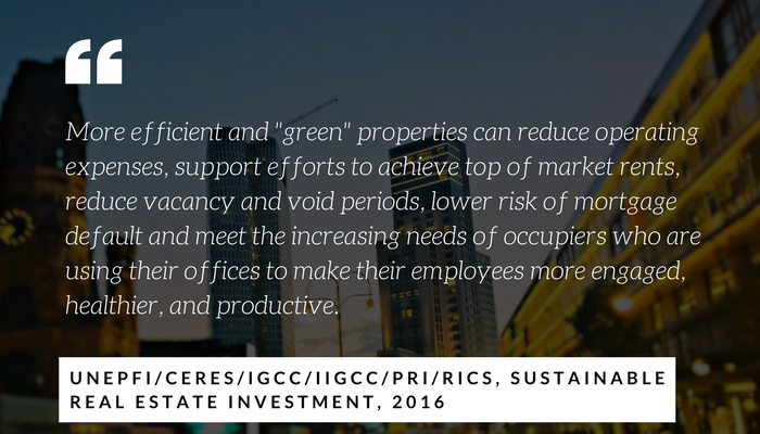 „Climate change also presents a major risk factor in terms of returns for real estate investors. With extreme weather events and changes to the environmental regulatory landscape increasing, climate concerns are beginning to impact liquidity prospects in the near to mid-term. For example, an inefficient building might fail to meet environmental standards.„