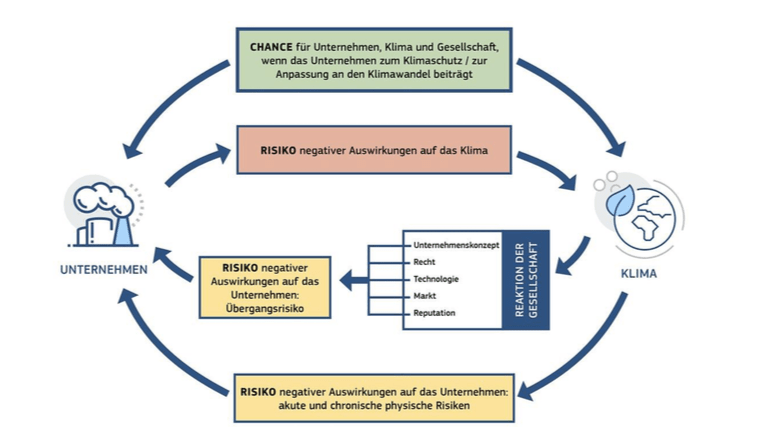 - Outside-in-Perspektive: Risiken und Chancen, die sich durch den Klimawandel und die (staatlichen, gesellschaftlichen, wirtschaftlichen etc.) Aktivitäten zum Klimaschutz bzw. zur Klimaanpassung für die eigene Organisation inkl. ihrer Strategie und Finanzplanung ergeben.