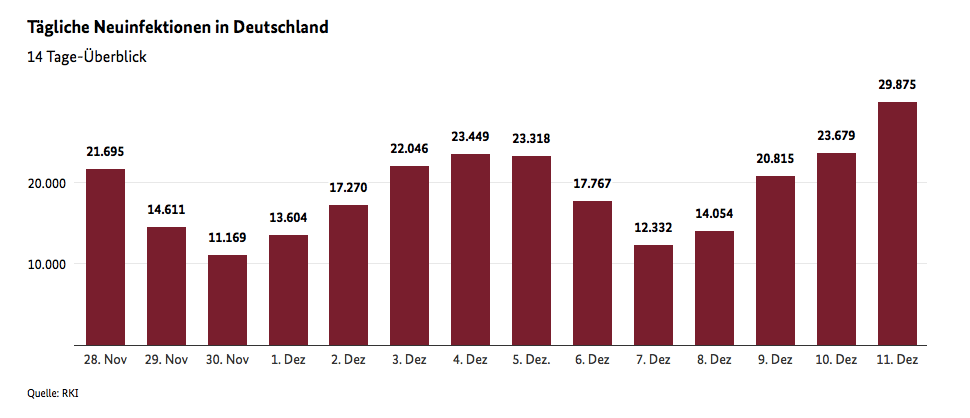 Wenig überraschend aufgrund der rasanten Infektionsentwicklung der letzten Tage. Am 11.11.2020 etwa appellierten die deutschen Intensivmediziner (Deutsche Interdisziplinäre Vereinigung für Intensiv- und Notfallmedizin, DIVI) an die Politik, unverzüglich zu handeln. Jeder weitere Tag ohne durchgreifende und nachhaltige Lockdown-Maßnahmen würde angesichts 30.000 Neuinfektionen am Tag und fast 600 Corona-Toten täglich Menschenleben kosten, zumal selbst ein sofortiger Lockdown die Zahlen erst in zwei bis drei Wochen deutlich sinken lasse. „Ein Zögern und Warten auf Weihnachten ist schier unverantwortlich“ – so der Präsident der DIVI.