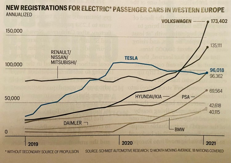 Das Interessante an der Geschichte ist, dass Tesla den weltweiten E-Auto-Markt mit ca. 18% der Verkäufe dominiert, aber nun ausgerechnet in Europa, wo man bislang von der langsamen Elektrifizierung der deutschen Wettbewerber profitierte und gezielt das Investment in die europäische/deutsche Giga-Fabrik tätigte, mit einer wachsendes Konkurrenz konfrontiert ist. „Tesla entered the EU against an empty playing Field. Now the Company has competeition“ (Fortune, Europe Edition No. 1, Febr./March 2021, p. 27). Gerade VW hat hier massiv Dynamik gewonnen. Eine aktuelle UBS-Studie sieht das Potential bei Volkswagen, schon 2022 Co-Weltmarktführer bei E-Autos zu werden.