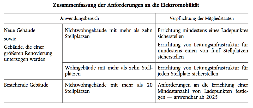 Dadurch werden der Kreis der Verpflichteten sowie die Ausstattungspflicht erweitert und bessere Voraussetzungen dafür geschaffen, den Ausbau der Leitungs- und Ladeinfrastruktur für die Elektromobilität zu beschleunigen.