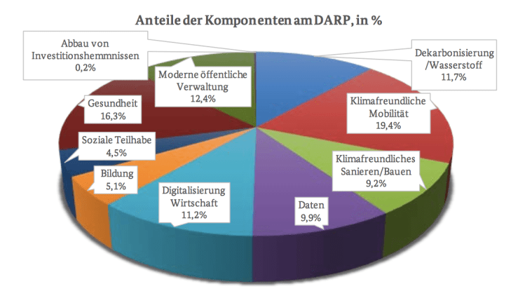 Vor allem aber hat die Bundesregierung am 27.04.2021 den Deutschen Aufbau- und Resilienzplan (DARP) beschlossen. Er hat mit dem eingangs dargestellten Aufbauinstrument „Next Generation EU“ in Höhe von 750 Mrd. Euro und dessen größtem Ausgabeninstrument – der Aufbau- und Resilienzfazilität (ARF) mit einem Volumen von 672,5 Mrd. Euro – zu tun. Deutschland stehen aus der ARF Mittel in Höhe von ca. 25 Milliarden Euro zu. Um die Mittel der ARF zu erhalten, müssen die Mitgliedstaaten Pläne für umfangreiche Investitionen und Reformen vorlegen, die die wirtschaftliche Erholung befördern und die soziale Resilienz stärken. Der Schwerpunkt des DARP liegt auf der Bewältigung der beiden großen Herausforderungen unserer Zeit, des Klimawandels und der digitalen Transformation.