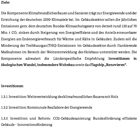 - Förderung des Um- und Neubaus privater und öffentlicher Bauten auf einem Energieeffizienz-Niveau, das deutlich über den gesetzlichen Mindeststandards liegt (davon werden 2,5 Mrd. EUR für die Sanierung von Wohngebäuden über den DARP gefördert, damit gehört das Gebäudesanierungsprogramm zu den größten Einzelmaßnahmen im DARP),