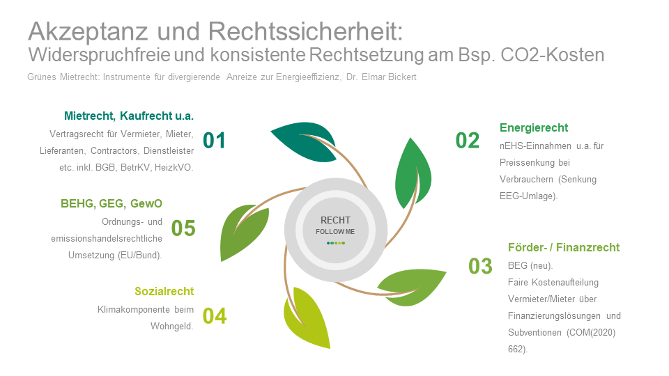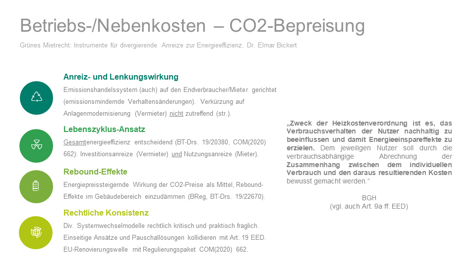 Einzelne Vorschläge zur Aufteilung von CO-Preisen zwischen Vermieter und Mieter (siehe etwa BMU/BMJV/BMF, Gemeinsame Eckpunkte zur Begrenzung der Umlagefähigkeit der CO2-Bepreisung, 16.09.2020; vgl. auch den Antrag BT-Drucks. 19/24432, am 03.03.2021 im Bauausschuss abgelehnt) laufen Gefahr, durch die Schaffung einer enormen rechtlichen Komplexität in Konflikt zu geraten mit den Anforderungen an eine konsistente und widerspruchsfreie Rechtsetzung und dadurch neben der rechtlichen Akzeptanz auch ihre Lenkungswirkung zu verfehlen. Sie bewegen sich im Mietrecht und Kauf- bzw. Dienstleistungsrecht (Vertragsrecht für Vermieter, Mieter, Lieferanten, Contractors, Dienstleistern etc. inkl. BGB, BetrKV, HeizkVO), im BEHG, GEG bzw. GewO mit einer ordnungs- und emissionshandelsrechtlichen Umsetzung (siehe auch die EU-Renovierungswelle mit Regulierungspaket COM(2020) 662), im Sozialrecht (Klimakomponente beim Wohngeld), im Energierecht (nEHS-Einnahmen u.a. für Preissenkung bei Verbrauchern, Senkung EEG-Umlage) sowie im Förder- und Finanzrecht (BEG neu; siehe auch die Idee einer fairen Kostenaufteilung Vermieter/Mieter über Finanzierungslösungen und Subventionen nach EU COM(2020) 662).