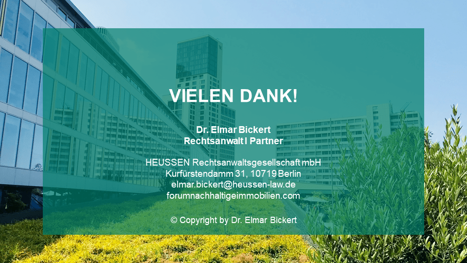 - Der Beitrag Grünes Mietrecht: Instrumente für divergierende Anreize zur Energieeffizienz (Text zu den Vorträgen und Präsentationen von Dr. Elmar Bickert im Rahmen der 4. Sitzung und der anschließenden Expertenrunde des DV Runden Tisches zum nachhaltigen Klimaschutz im Gebäudebestand am 21.01./17.02.2021)