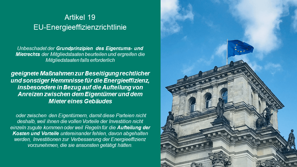 Eine zentrale Ausgangslage für divergierende Anreize zur Energieeffizienz im Gebäudesektor ist der europarechtliche Auftrag an die Mitgliedstaaten zur Lösung des Vermieter-Mieter-Dilemmas bzw. des Investor-Nutzer-Dilemmas. Nach Art. 19 EU-Energieeffizienzrichtlinie beurteilen und ergreifen die Mitgliedstaaten insbesondere in Bezug auf die Aufteilung von Anreizen zwischen dem Eigentümer und dem Mieter eines Gebäudes geeignete Maßnahmen zur Beseitigung rechtlicher und sonstiger Hemmnisse für die Energieeffizienz, damit diese Parteien nicht deshalb, weil ihnen die vollen Vorteile der Investition nicht einzeln zugute kommen oder weil Regeln für die Aufteilung der Kosten und Vorteile untereinander fehlen, davon abgehalten werden, Investitionen zur Verbesserung der Energieeffizienz vorzunehmen.