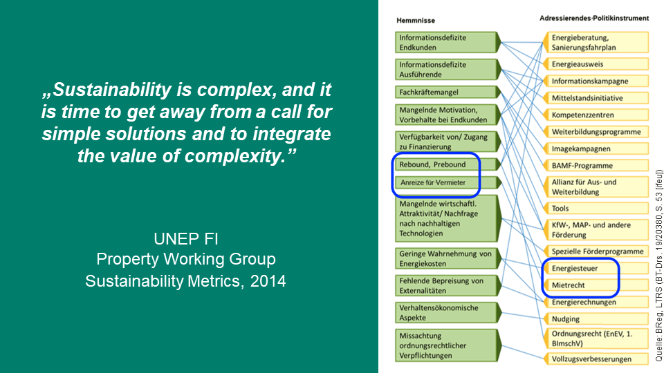 Eine Vernachlässigung von Nutzungsanreizen beim Mieter kommt zudem in Konflikt mit dem Lebenszyklusansatz. Der Lebenszyklusansatz fordert die Berücksichtigung von Investitionsanreizen in der Bau-, Sanierungs- und Modernisierungsphase (Vermieter) und Nutzungsanreizen in der Nutzungs-/Betriebsphase (Mieter). Folglich steht auch die Maßgeblichkeit der Gesamtenergieeffizienz (siehe nur BT-Drs. 19/20380 und EU COM(2020) 662) einer Vernachlässigung der Nutzungsphase entgegen. Insbesondere sind in diesem Zusammenhang Rebound-Effekte zu adressieren und dürfen nicht ausgeblendet werden. Tatsächlich wird gerade die energiepreissteigernde Wirkung der CO2-Preise als Mittel definiert, Rebound-Effekte im Gebäudebereich einzudämmen (Bundesregierung, BT-Drs. 19/22670).