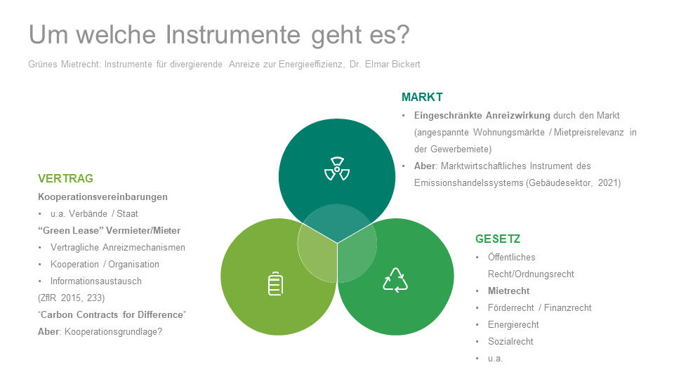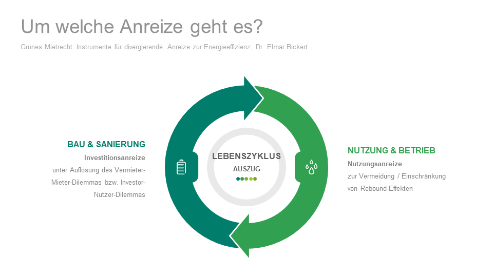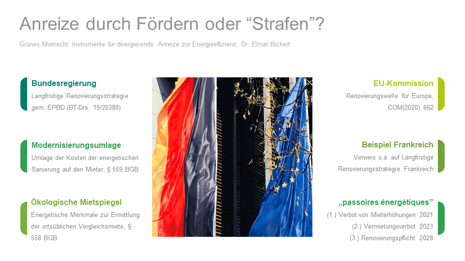 Nach Art. 19 EU-Energieeffizienzrichtlinie bleiben die Grundprinzipien des Eigentums- und Mietrechts der Mitgliedstaaten unberührt. Zu den Grundprinzipien des deutschen Mietrechts gehört es, dass (1.) der Vermieter dem Mieter die Mietsache zum Gebrauch überlässt und (2.) im Gegenzug eine Miete erhält sowie (3.) grundsätzlich auch die Betriebs- und Nebenkosten der Mietsache auf den Mieter umlegen kann. Auf allen drei Ebenen werden Anreizinstrumente diskutiert.