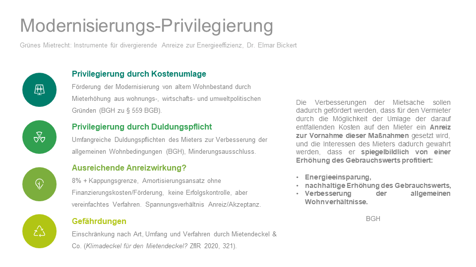 Sowohl die Modernisierungsumlage wie auch ökologische Mietspiegel sind gefährdet durch Mietpreisregulierungen, wenn diese die Modernisierungsumlage nach Art, Umfang und Verfahren einschränken und das Vergleichsmietensystem sowie die Marktbezogenheit der Miete ausschalten (ausführlich: Bickert, Ein Klimadeckel für den Mietendeckel?, ZfIR 2020, 321).