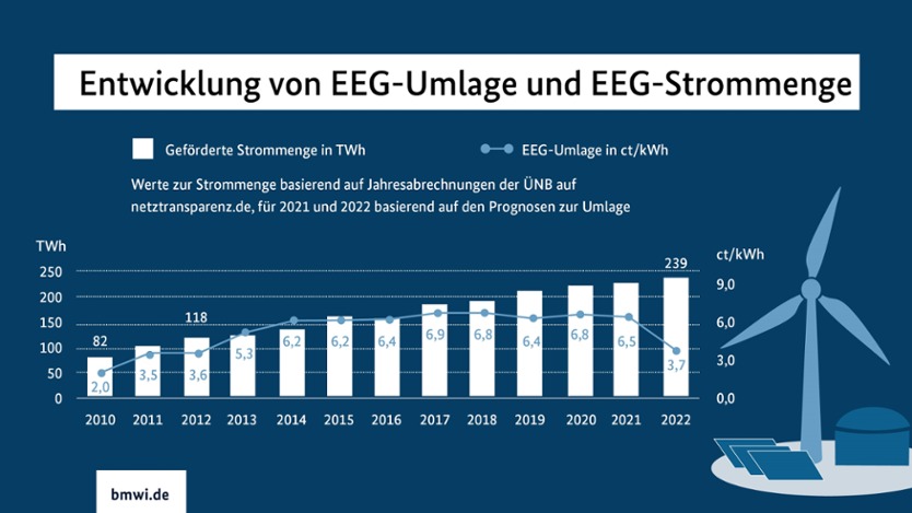 Auch haben soeben die Übertragungsnetzbetreiber auf der Grundlage des Erneuerbare- Energien-Gesetzes (EEG) sowie der Erneuerbare-Energien-Verordnung die Höhe der EEG-Umlage für das Jahr 2022 bekanntgegeben: Die EEG-Umlage wird von derzeit 6,5 ct/kWh ab Januar 2022 auf 3,723 ct/kWh abgesenkt. Im Vergleich zum Vorjahr sinkt die EEG-Umlage um 2,8 ct/kWh bzw. 43 Prozent. Damit liegt die EEG-Umlage 2022 auf dem niedrigsten Stand seit 10 Jahren – und dies trotz einer Verdoppelung der EEG-Strommenge von 118 auf 239 Terawattstunden (Anstieg von 103 Prozent). Ein Grund für die Absenkung besteht darin, dass Teile der Einnahmen aus der neuen nationalen CO2-Bepreisung (Brennstoffemissionshandelsgesetz – BEHG) seit 2021 zur Senkung der EEG-Umlage verwendet werden. Als Gegenstück zur Belastung in den Sektoren Wärme und Verkehr sollen so die Strompreise entlastet werden.