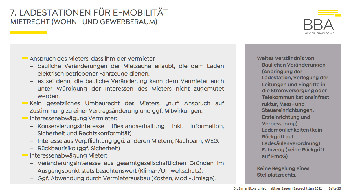 Der neue Anspruch des Mieters nach § 554 Abs. 1 BGB darauf, dass ihm der Vermieter bauliche Veränderungen der Mietsache erlaubt, die dem Laden elektrisch betriebener Fahrzeuge dienen, ist kraft Gesetzes abhängig von einer Abwägug der wechselseitigen Interessen (siehe nebenstehende Übersicht). Das macht die Anwendung unsicher – und Gerichtsentscheidungen zur weiteren Konkretisierung umso wichtiger.
