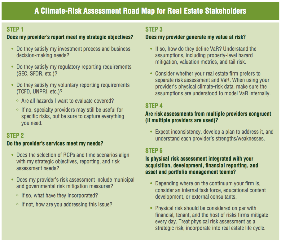 Thereby the report states, that institutional real estate managers would do well to carefully articulate their use case needs—specifically regarding valuation and value at risk. In that sense, during the period when the real estate industry develops standardized and industry-accepted practices, tools like the climate-risk assessment road map described adjacent could help to make more informed decisions.