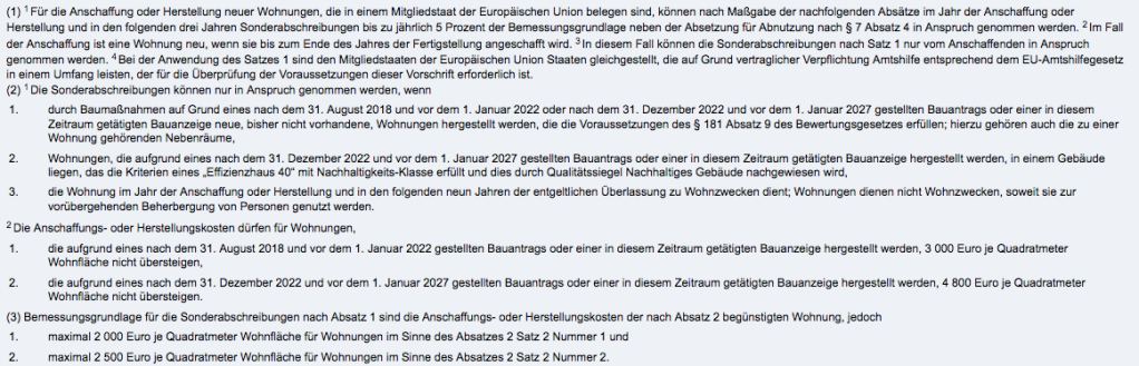 - Zur stärkeren Unterstützung einer klimagerechten Neubauoffensive wurde der lineare AfA-Satz für die Abschreibung von Wohngebäuden (Absetzung für Abnutzung = AfA) auf 3 Prozent erhöht und wurde dies als Ergebnis der parlamentarischen Beratungen gegenüber dem Regierungsentwurf sogar noch auf den 1. Januar 2023 vorgezogen.