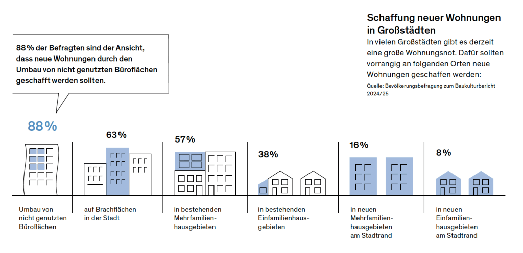 Nach einer Umfrage aus dem Baukulturbericht 2024/25 der Bundesstiftung Baukultur ist der Umbau von nicht mehr genutzten Bürfoflächen trotzdem die erste Option für die Schaffung von neuen Wohnungen: