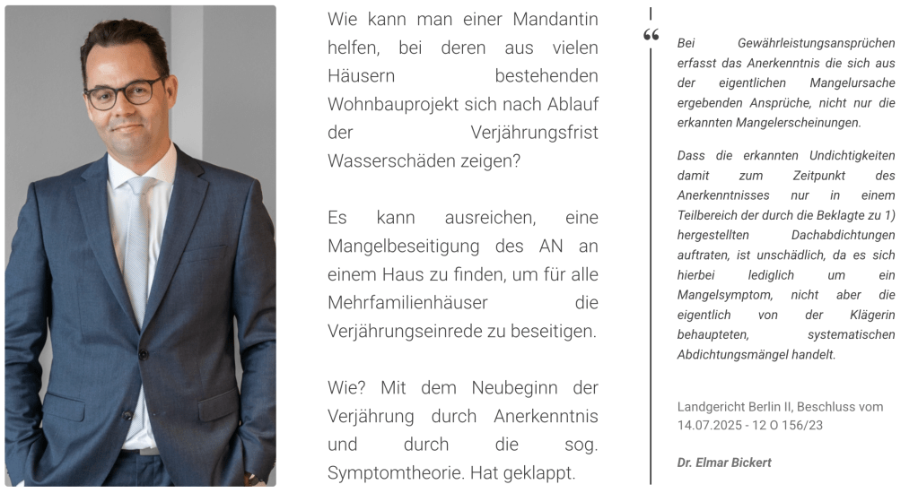 - Für den Neubeginn der Verjährung durch Anerkenntnis (Nacherfüllungen des Auftragnehmers) wird das dann quasi gespiegelt. Indem der Auftragnehmer bei einem von neun Häusern eine Mangelbeseitigung vornahm, hatte er auch für alle weiteren Häuser ein Anerkenntnis erklärt und war bezogen auf den Abdichtungsmangel ein Neubeginn der Verjährung für alle Häuser erfolgt.