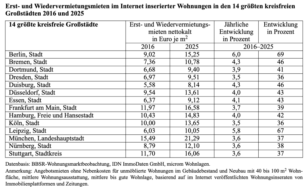 Aus einer Antwort der Bundesregierung vom 25.03.2026 auf eine parlamentarische Anfrage zu den Mietpreisen der im Internet inserierten Wohnungen in den letzten zehn Jahren in den nach Einwohnerzahl vierzehn größten Städten Deutschlands folgt eine Rangfolge der teuersten (Miete) Städte, Top 5 zum Stand 2025: